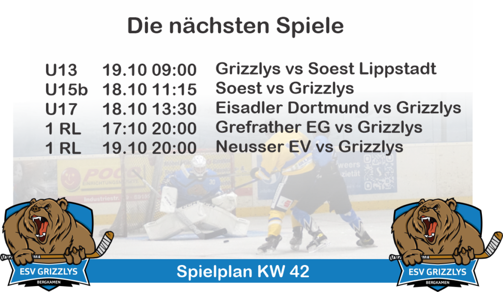 Am kommenden Freitag fahren die Grizzlys nach Grefrath, Bulli ist um 20 Uhr. Und am kommenden Sonntag geht es weiter nach Neuss, auch dort ist um 20 Uhr Bulli.